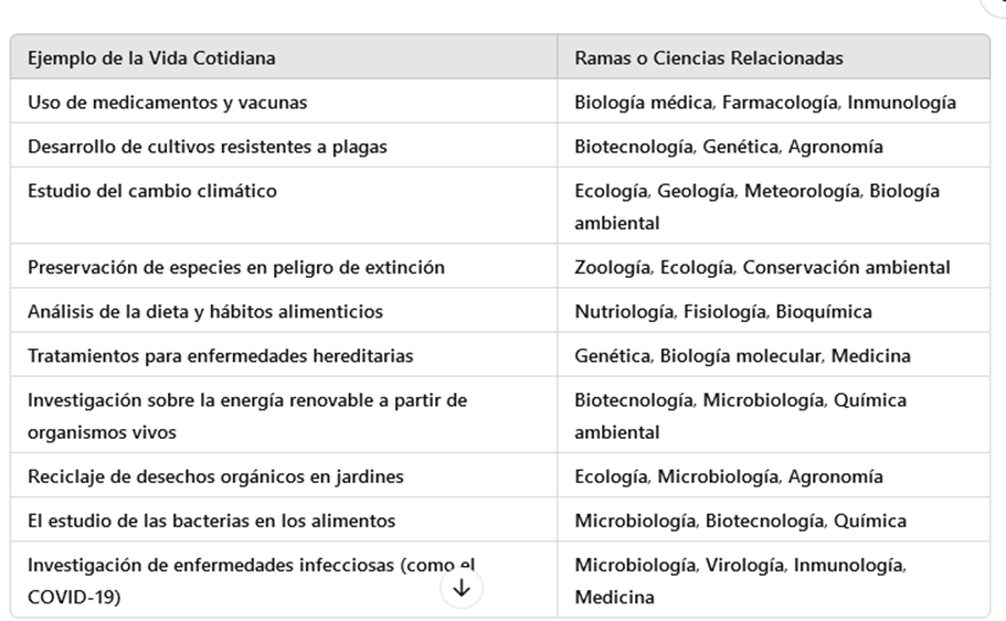 III-Elabore un cuadro de doble entrada donde mediante ejemplos de la vida cotidiana deberán completar con cada una de las ramas de la biología y ciencias auxiliares donde se aplican