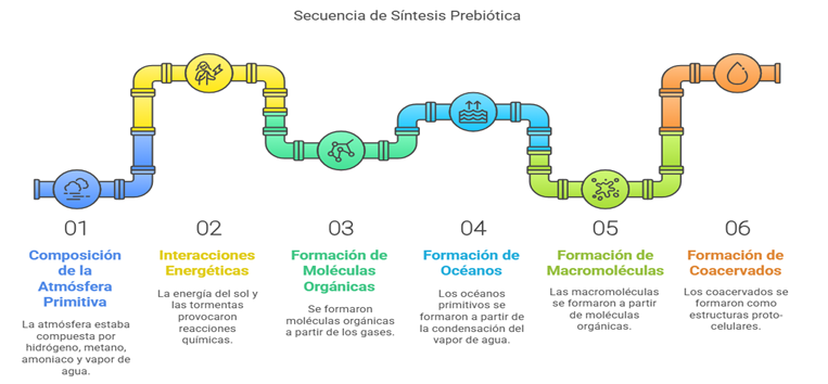 Síntesis Prebiótica fue un término utilizado en 1924, por el bioquímico ruso Alexander Oparin. Oparin postulo que, gracias a la energía procedente primordialmente por la radiación ultravioleta procedente del Sol y a las descargas eléctricas de las constantes tormentas, las pequeñas moléculas de los gases atmosféricos dieron lugar a unas moléculas orgánicas llamadas prebióticas. Estas moléculas, cada vez más complejas, eran aminoácidos y ácidos nucleicos. Según Oparin, estas primeras moléculas quedarían atrapadas en las charcas de aguas poco profundas formadas en el litoral del océano primitivo, lo que el llamo Caldo Primordial. Al concentrarse, continuaron evolucionando y diversificándose |
