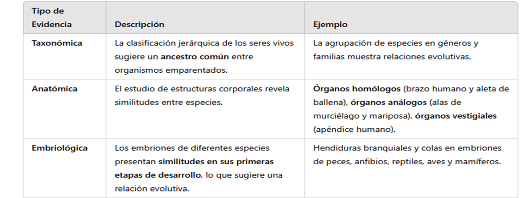 ____ Muchos organismos muestran similitudes en su desarrollo embrionario. ____ La presencia de estructuras homólogas en diferentes especies sugiere un ancestro común. ____ Comparaciones de secuencias de ADN, ARN y proteínas moléculas de ATP muestran similitudes entre diferentes especies, lo que sugiere un ancestro común. ______ Las poblaciones presentan variabilidad genética debido a la mutación, la recombinación genética y la migración. ______ El registro fósil muestra la sucesión de formas de vida a lo largo del tiempo y revela transiciones evolutivas. |