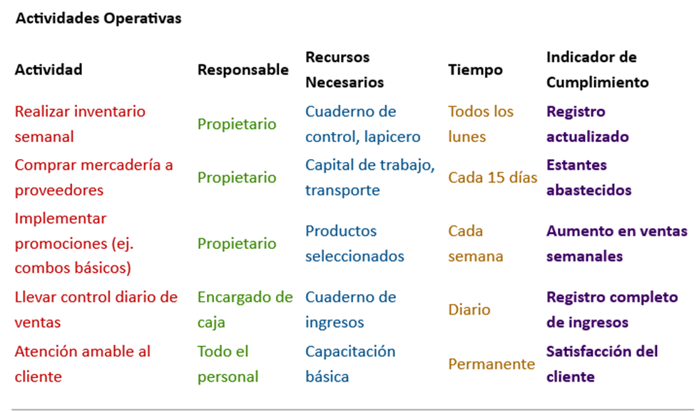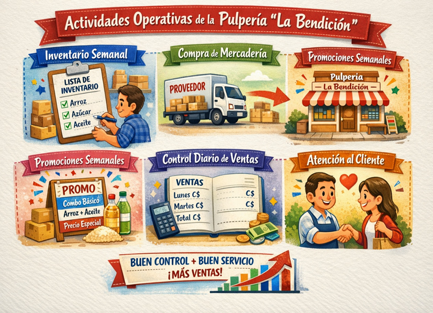 En un caso hipotético de emprendedurismo, las actividades operativas permiten que la pulpería La Bendición funcione de manera ordenada, eficiente y rentable, contribuyendo al logro del objetivo general del plan operativo. Ejemplo: