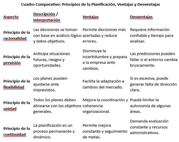 A continuación, te muestro una manera práctica de interpretar los principios de la planificación, sus ventajas y desventajas.